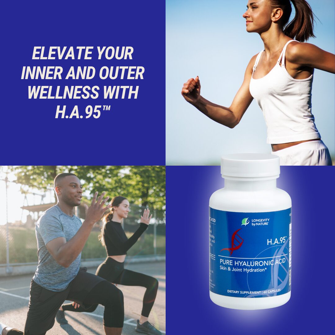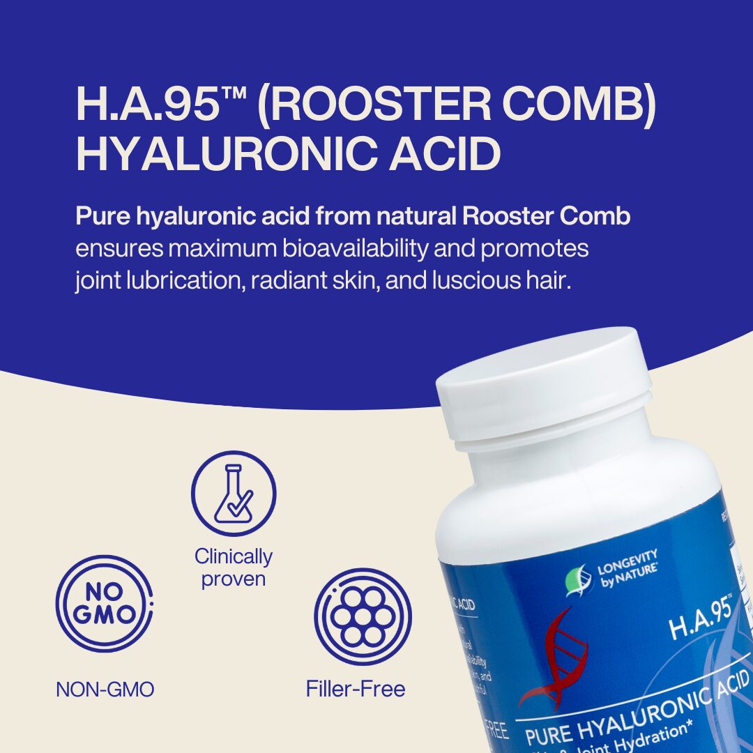 Elevate your inner and outer wellness with H.A.95™. Pure hyaluronic acid from natural Rooster Comb ensures maximum bioavailability and promotes joint lubrication, radiant skin, and luscious hair. Unlock the secret to a youthful glow with H.A.95™ —your key to holistic health and beauty.*
